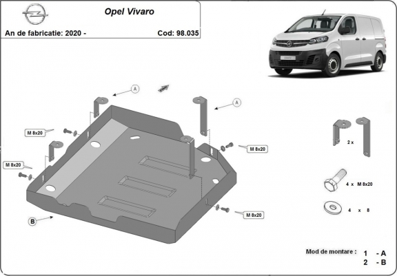 Protetores de cárter em Aço para a proteção do depósito de AdBlue The skid plate is new and fits perfectly for all versions of Opel Vivaro manufactured between 2020 and 2026. Os nossos protetores de cárter são feitos com chapas de aço com 2 mm de espessura com pintura eletrostática. Entregue com todos os acessórios necessários (parafusos, porcas, grampos). Todas os protetores de cárter possuem um revestimento em pó para impedir a corrosão. |