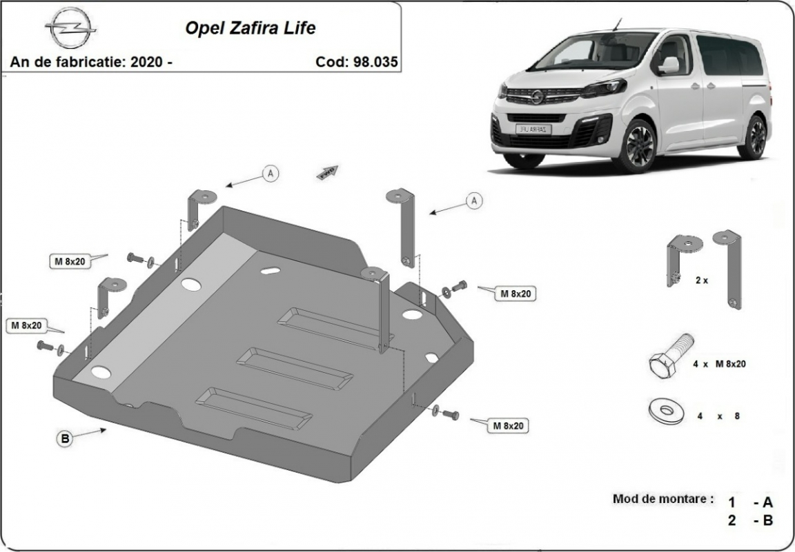 Protetores de cárter em Aço para a proteção do depósito de AdBlue The skid plate is new and fits perfectly for all versions of Opel Zafira Life manufactured between 2020 and 2026. Os nossos protetores de cárter são feitos com chapas de aço com 2 mm de espessura com pintura eletrostática. Entregue com todos os acessórios necessários (parafusos, porcas, grampos). Todas os protetores de cárter possuem um revestimento em pó para impedir a corrosão. |