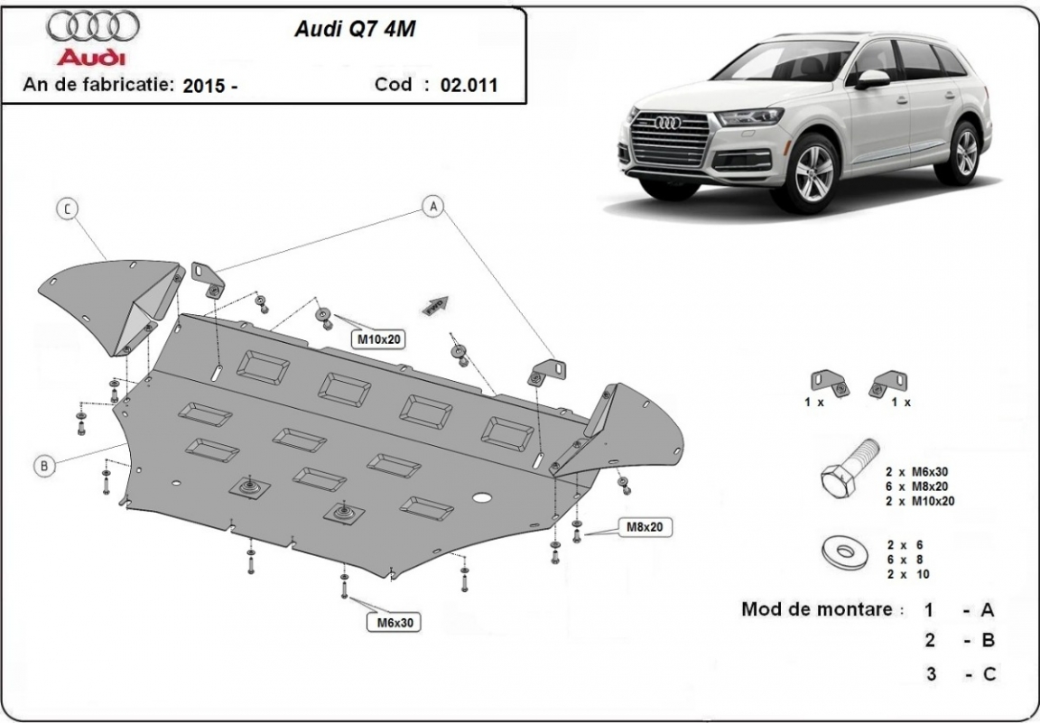 Protetores de cárter em Aço para a proteção do motor, radiador, pára-choques dianteiro The skid plate is new and fits perfectly for all versions of Audi Q7 manufactured between 2015 and 2026. Os nossos protetores de cárter são feitos com chapas de aço com 2 mm de espessura com pintura eletrostática. Entregue com todos os acessórios necessários (parafusos, porcas, grampos). Todas os protetores de cárter possuem um revestimento em pó para impedir a corrosão. |