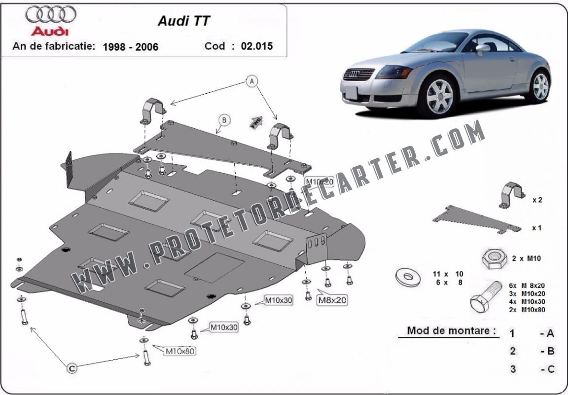 Protetores de cárter em Aço para a proteção do motor, caixa de velocidades, radiador, pára-choques dianteiro The skid plate is new and fits perfectly for all versions of Audi TT manufactured between 1998 and 2006. Possui uma abertura para o cárter do óleo, portanto, a respetiva remoção não será necessária para mudar o óleo. Os nossos protetores de cárter são feitos com chapas de aço com 2 mm de espessura com pintura eletrostática. Entregue com todos os acessórios necessários (parafusos, porcas, grampos). Todas os protetores de cárter possuem um revestimento em pó para impedir a corrosão. |