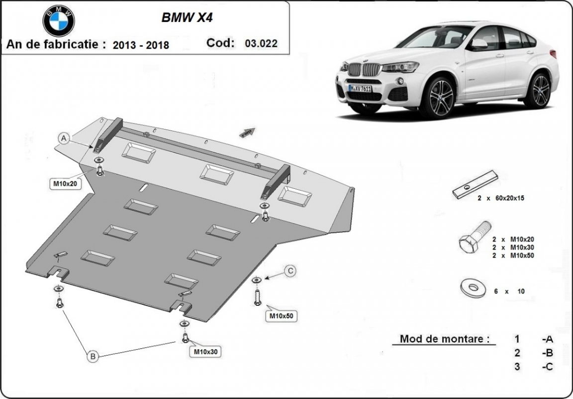 Protetores de cárter em Aço para a proteção do motor, radiador, pára-choques dianteiro The skid plate is new and fits perfectly for all versions of BMW X4 manufactured between 2014 and 2018. Os nossos protetores de cárter são feitos com chapas de aço com 2 mm de espessura com pintura eletrostática. Entregue com todos os acessórios necessários (parafusos, porcas, grampos). Todas os protetores de cárter possuem um revestimento em pó para impedir a corrosão. |