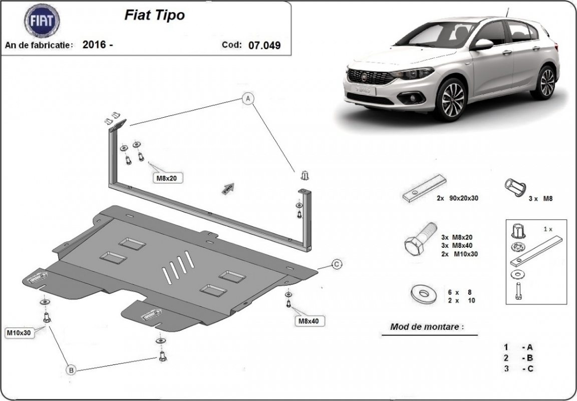 Protetores de cárter em Aço para a proteção do motor, caixa de velocidades, radiador The skid plate is new and fits perfectly for all versions of Fiat Tipo manufactured between 2015 and 2026. Os nossos protetores de cárter são feitos com chapas de aço com 2 mm de espessura com pintura eletrostática. Entregue com todos os acessórios necessários (parafusos, porcas, grampos). Todas os protetores de cárter possuem um revestimento em pó para impedir a corrosão. |