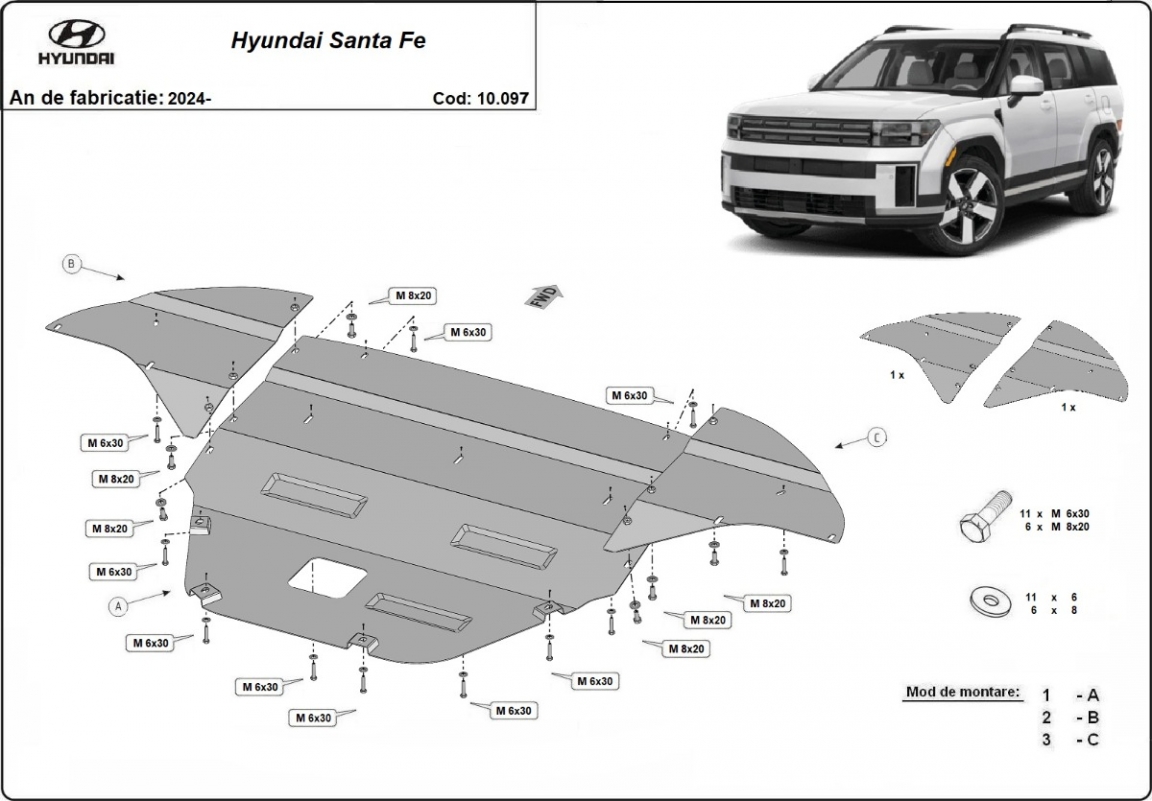 Protetores de cárter em Aço para a proteção do motor, caixa de velocidades, radiador, pára-choques dianteiro The skid plate is new and fits perfectly for all versions of Hyundai Santa Fe manufactured between 2024 and 2026. Os nossos protetores de cárter são feitos com chapas de aço com 2 mm de espessura com pintura eletrostática. Entregue com todos os acessórios necessários (parafusos, porcas, grampos). Todas os protetores de cárter possuem um revestimento em pó para impedir a corrosão. |