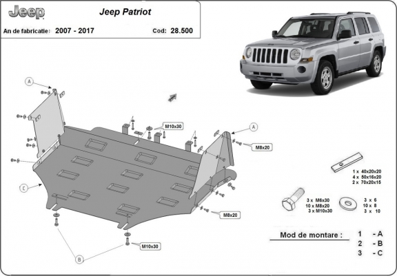 Protetores de cárter em Aço para a proteção do motor, radiador, pára-choques dianteiro The skid plate is new and fits perfectly for all versions of Jeep Patriot manufactured between 2007 and 2017. Os nossos protetores de cárter são feitos com chapas de aço com 2 mm de espessura com pintura eletrostática. Entregue com todos os acessórios necessários (parafusos, porcas, grampos). Todas os protetores de cárter possuem um revestimento em pó para impedir a corrosão. |