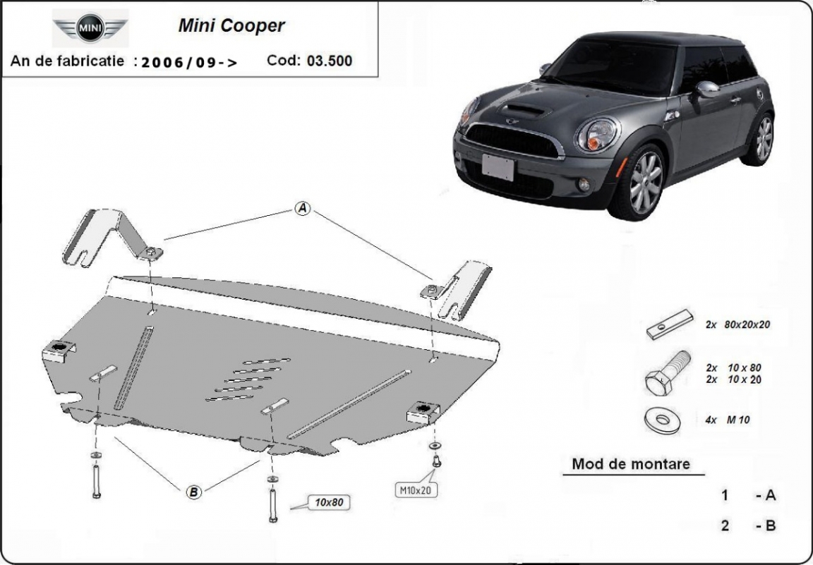 Protetores de cárter em Aço para a proteção do motor, caixa de velocidades The skid plate is new and fits perfectly for all versions of Mini Cooper R56 manufactured between 2006 and 2014. Os nossos protetores de cárter são feitos com chapas de aço com 2 mm de espessura com pintura eletrostática. Entregue com todos os acessórios necessários (parafusos, porcas, grampos). Todas os protetores de cárter possuem um revestimento em pó para impedir a corrosão. |