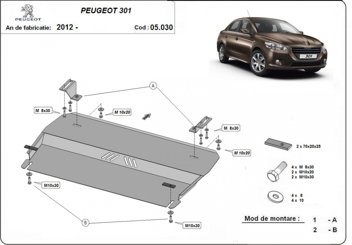 Protetores de cárter em Aço para a proteção do motor, caixa de velocidades The skid plate is new and fits perfectly for all versions of Peugeot 301 manufactured between 2012 and 2026. Os nossos protetores de cárter são feitos com chapas de aço com 2 mm de espessura com pintura eletrostática. Entregue com todos os acessórios necessários (parafusos, porcas, grampos). Todas os protetores de cárter possuem um revestimento em pó para impedir a corrosão. |