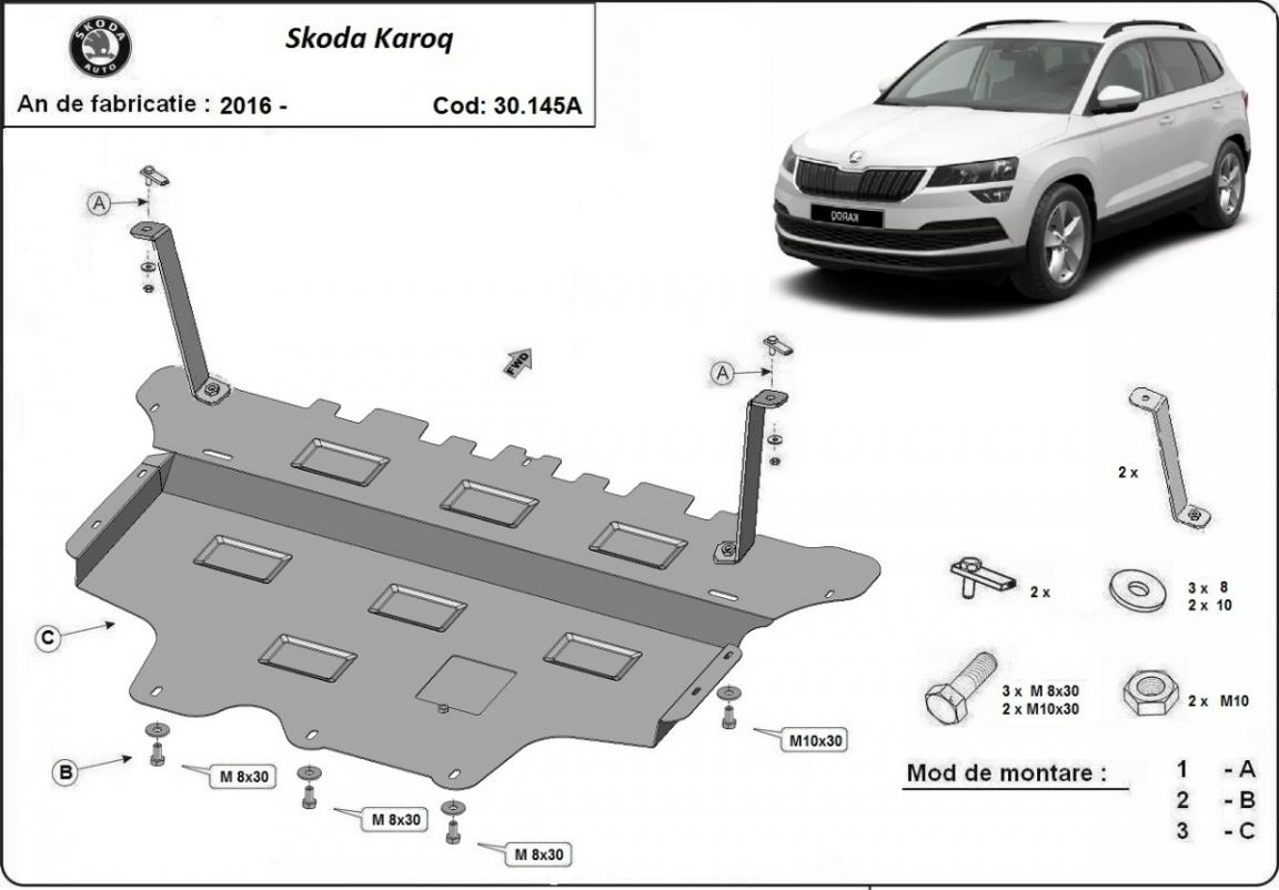 Protetores de cárter em Aço para a proteção do motor, caixa de velocidades, radiador, pára-choques dianteiro The skid plate is new and fits perfectly for all versions of Skoda Karoq manufactured between 2016 and 2026. Os nossos protetores de cárter são feitos com chapas de aço com 2 mm de espessura com pintura eletrostática. Entregue com todos os acessórios necessários (parafusos, porcas, grampos). Todas os protetores de cárter possuem um revestimento em pó para impedir a corrosão. |