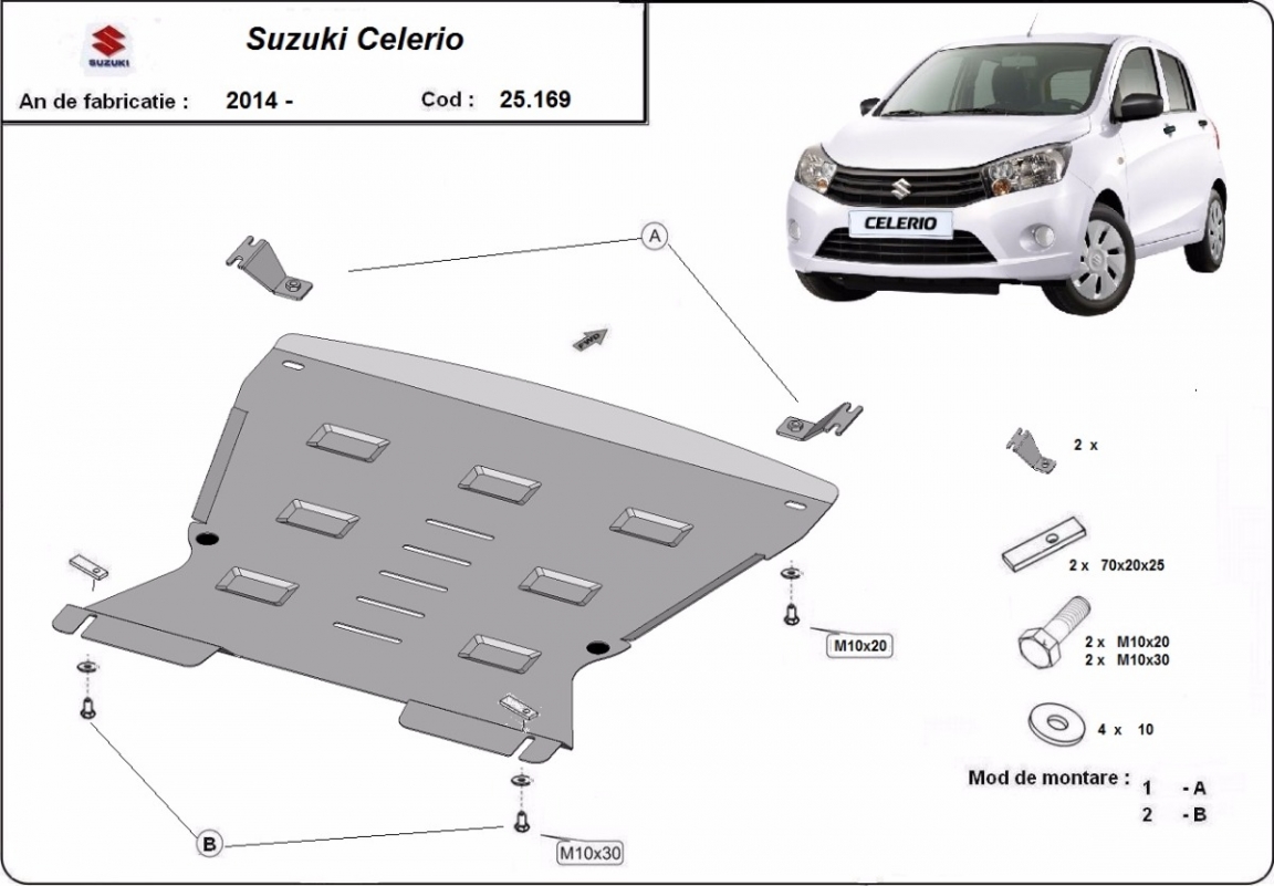 Protetores de cárter em Aço para a proteção do motor, caixa de velocidades, radiador, pára-choques dianteiro The skid plate is new and fits perfectly for all versions of Suzuki Celerio manufactured between 2014 and 2026. Os nossos protetores de cárter são feitos com chapas de aço com 2 mm de espessura com pintura eletrostática. Entregue com todos os acessórios necessários (parafusos, porcas, grampos). Todas os protetores de cárter possuem um revestimento em pó para impedir a corrosão. |