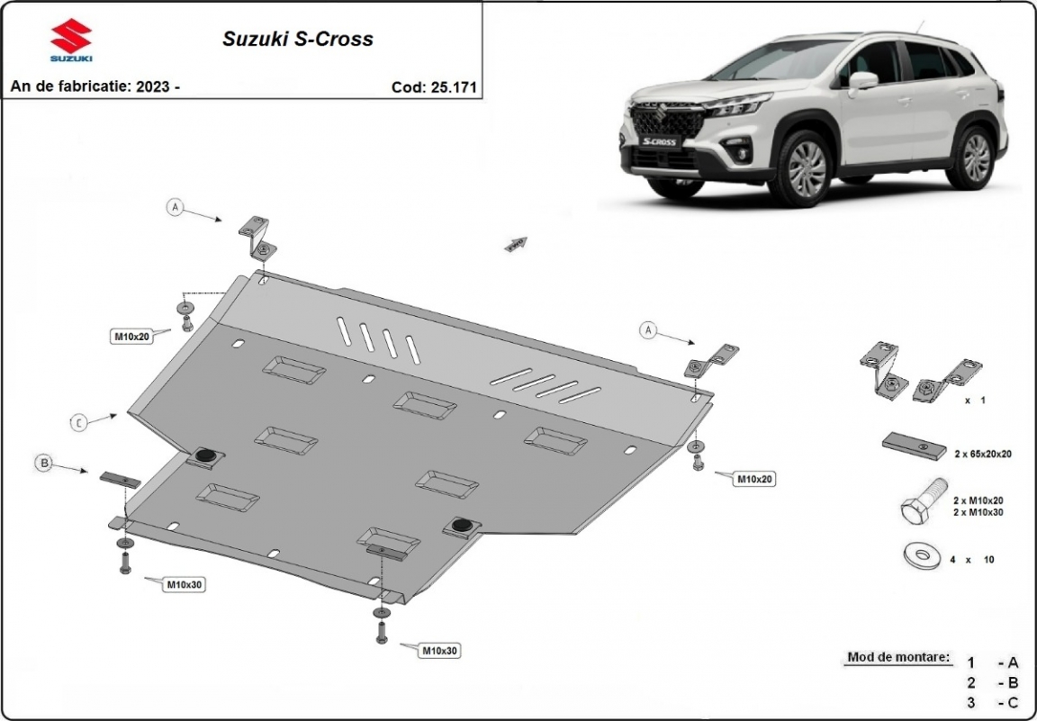 Protetores de cárter em Alumínio para a proteção do motor, caixa de velocidades, radiador The skid plate is new and fits perfectly for all versions of Suzuki S-Cross manufactured between 2023 and 2026. Os nossos protetores de cárter são feitos com chapas de aço com 3 mm de espessura com pintura eletrostática. Os escudos são de alumínio, mas os suportes de fixação são de aço. Entregue com todos os acessórios necessários (parafusos, porcas, grampos). Todas os protetores de cárter possuem um revestimento em pó para impedir a corrosão. |