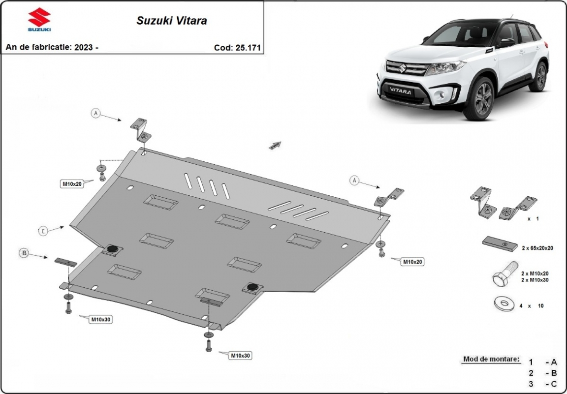 Protetores de cárter em Alumínio para a proteção do motor, caixa de velocidades, radiador The skid plate is new and fits perfectly for all versions of Suzuki Vitara manufactured between 2023 and 2026. Os nossos protetores de cárter são feitos com chapas de aço com 3 mm de espessura com pintura eletrostática. Os escudos são de alumínio, mas os suportes de fixação são de aço. Entregue com todos os acessórios necessários (parafusos, porcas, grampos). Todas os protetores de cárter possuem um revestimento em pó para impedir a corrosão. |