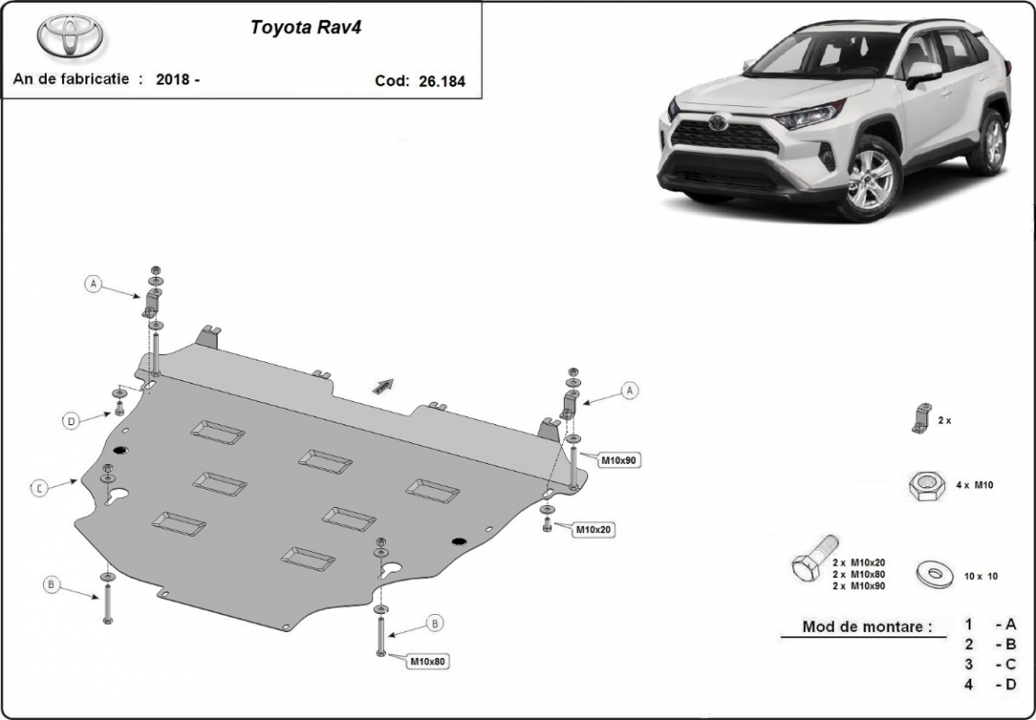Protetores de cárter em Alumínio para a proteção do motor, caixa de velocidades, radiador, pára-choques dianteiro The skid plate is new and fits perfectly for all versions of Toyota RAV4 manufactured between 2018 and 2026. Os nossos protetores de cárter são feitos com chapas de aço com 4 mm de espessura com pintura eletrostática. Os escudos são de alumínio, mas os suportes de fixação são de aço. Entregue com todos os acessórios necessários (parafusos, porcas, grampos). Todas os protetores de cárter possuem um revestimento em pó para impedir a corrosão. |