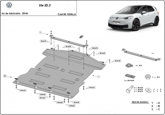 Protetores de cárter em Alumínio para a proteção do motor, caixa de velocidades, radiador The skid plate is new and fits perfectly for all versions of Volkswagen ID.3 manufactured between 2019 and 2026. Os nossos protetores de cárter são feitos com chapas de aço com 3 mm de espessura com pintura eletrostática. Os escudos são de alumínio, mas os suportes de fixação são de aço. Entregue com todos os acessórios necessários (parafusos, porcas, grampos). Todas os protetores de cárter possuem um revestimento em pó para impedir a corrosão. |