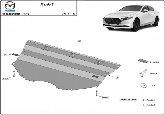 Protetores de cárter em Aço para a proteção do motor, caixa de velocidades The skid plate is new and fits perfectly for all versions of Mazda 3 manufactured between 2019 and 2026. Os nossos protetores de cárter são feitos com chapas de aço com 2 mm de espessura com pintura eletrostática. Entregue com todos os acessórios necessários (parafusos, porcas, grampos). Todas os protetores de cárter possuem um revestimento em pó para impedir a corrosão. |
