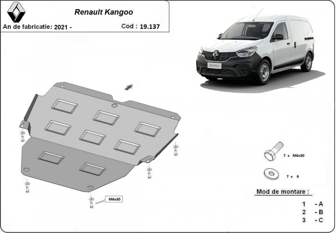 Protetores de cárter em Aço para a proteção do motor, caixa de velocidades The skid plate is new and fits perfectly for all versions of Renault Kangoo manufactured between 2021 and 2026. Os nossos protetores de cárter são feitos com chapas de aço com 2 mm de espessura com pintura eletrostática. Entregue com todos os acessórios necessários (parafusos, porcas, grampos). Todas os protetores de cárter possuem um revestimento em pó para impedir a corrosão. |